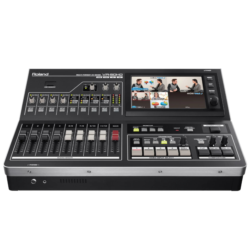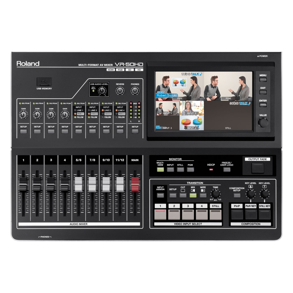A complete portable HD studio in a single unit. Single-person operation of sound and picture using faders, buttons and touch screen. The Roland VR-50HD all-in-one AV mixer beautifully integrates an audio mixer, video switcher, multi-viewer touch screen and USB video/audio streaming into a stand-alone device.
